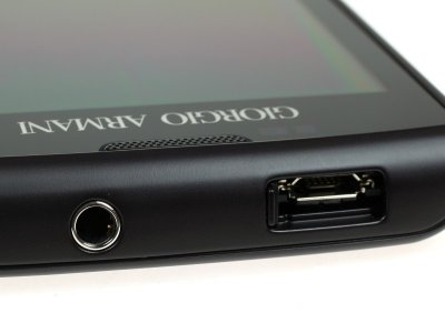 На левой боковой грани находится качелька регулировки громкости, а симметрично ей на правой стороне находится кнопка включения/блокировки устройства. Видимо, из соображений симметрии у Samsung I9010 Galaxy S Giorgio Armani нет кнопки активации камеры. К этому легко привыкнуть.