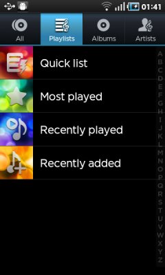 В смартфоне I9010 Galaxy S GA установлен аудиопроигрыватель TouchWiz. Меню состоит из нескольких вкладок: текущий список воспроизведения, все треки, плейлисты, альбомы, исполнители и композиторы. Пользователю доступно добавление/удаление этих вкладок. Плеер оснащен эквалайзером с технологией Samsung DNSe. Можно включить визуализацию (кстати, весьма приличную), при наличии отображается обложка альбома.