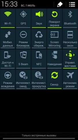 Панель уведомлений достаточно информативная, на одном её окне содержатся уведомления о событиях, а на другом окне расположены пиктограммы для управления разными режимами работы устройства и беспроводными модулями. С панели уведомлений можно быстро перейти к настройкам смартфона.