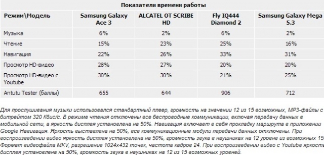 Под максимальной нагрузкой смартфон Samsung Galaxy Ace 3 проработал четыре с половиной часа. Таким образом, можно с уверенностью утверждать, что при рациональном использовании мультимедийных возможностей смартфона он без проблем проработает от одного заряда до трёх дней.