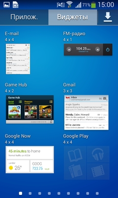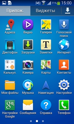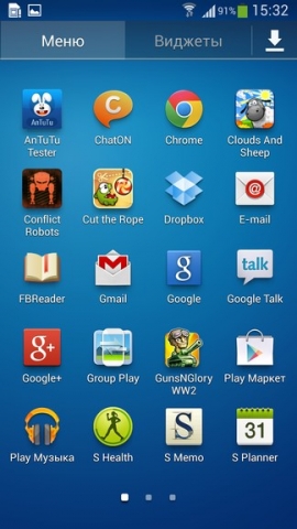 Список всех имеющихся на смартфоне приложений разделён на два пункта - «Виджеты» и «Загруженные». Ярлыки в списке «Загруженные» расположены матрицей размером 4х5. Ярлыки можно менять местами либо сортировать по различным параметрам.