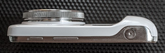 На правой боковой грани смартфона Samsung Galaxy S4 Zoom расположены круглая кнопка затвора камеры, которая поддерживает функцию полунажатия для автофокусировки, спаренная кнопка регулировки громкости и кнопка питания, обозначенная соответствующим символом. Все вышеперечисленные кнопки расположены на серебристой хромированной вставке, окантовывающей корпус смартфона по периметру.