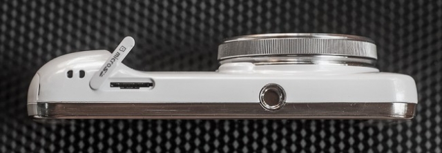 На левой боковой грани Samsung Galaxy S4 Zoom находятся стандартное металлическое штативное 0,25-дюймовое гнездо, которое можно использовать со стандартным фотооборудованием, слот для карты памяти формата microSD и отверстия, используемые для того, чтобы одеть на смартфон ремешок.