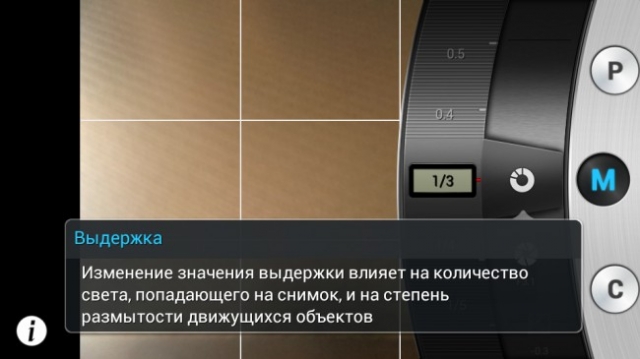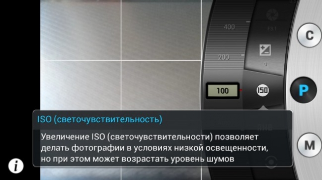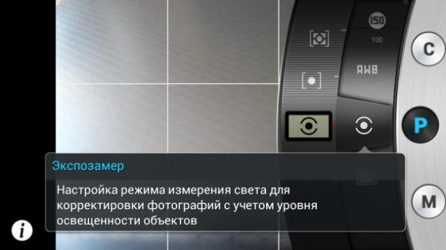 Предустановленное приложение «Камера» предлагает пользователю точечный, матричный и центровзвешенный варианты замера освещённости.