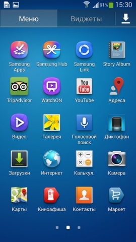 В нижней части дисплея находятся самые востребованные ярлыки и иконка перехода к меню приложений, которые не изменяются независимо от рабочего стола. Все ярлыки можно заменить на более востребованные, а иконку перехода к меню установленных приложений заменить или удалить невозможно. Меню приложений разделено на три раздела - виджеты, загрузки и приложения.