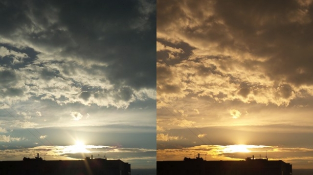 Пример съёмки в режиме «Закат». Первый снимок сделан в автоматическом режиме съёмки с автоматической регулировкой баланса белого, а второй снимок сделан в режиме Smart: