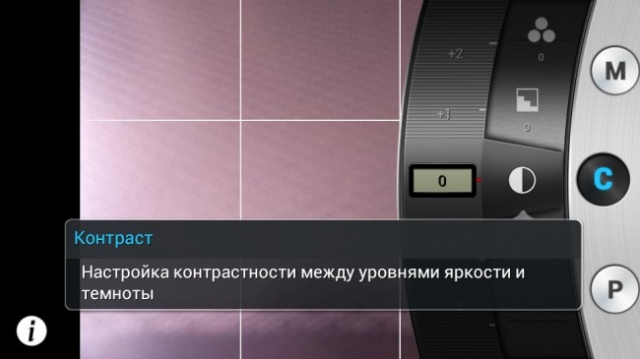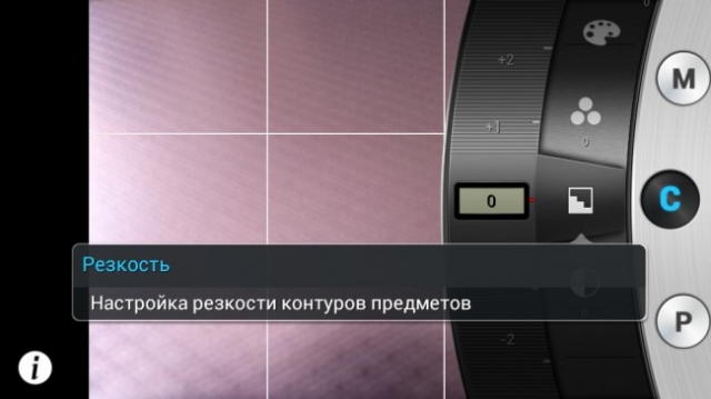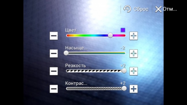 Пользователю доступны настройки контрастности, резкости и насыщенности. При максимально отрицательной резкости снимок приобретает эффект лёгкого размытия.