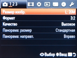 Меню Sony SLT-A58 состоит из 7 разделов: меню настроек камеры, меню режимов съемки, меню работы с картой памяти, меню пользовательских установок, меню режима видеозаписи, меню режима воспроизведения, меню настройки даты и времени.