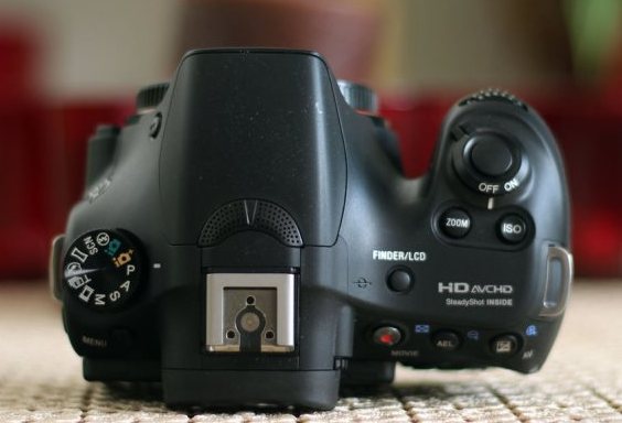 На верхней панели Sony SLT-A58 расположены отверстие стереомикрофона, встроенная выдвигающаяся вспышка и «горячий башмак», предназначенный для крепления внешней вспышки. «Башмак» крышкой не прикрывается.
