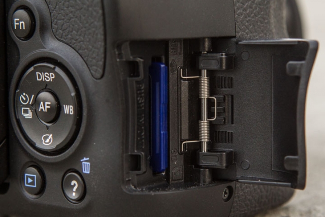 На левой боковине устройства находится слот для карт памяти. Аппарат имеет поддержку карт SD (включая SDXC и SDHC), PRO-HG Duo и Sony Memory Stick PRO Duo.