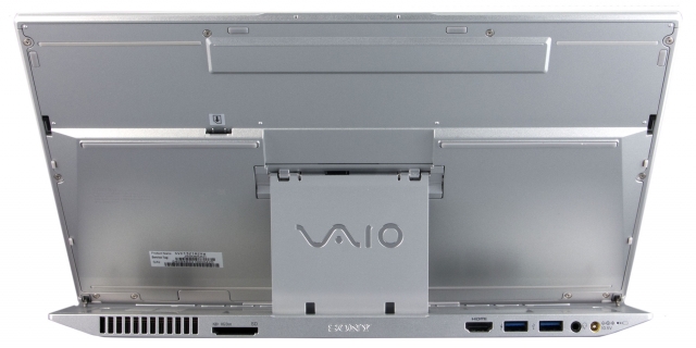 На задней грани аппарата располагаются отверстие для подключения зарядного устройства, два разъёма USB 3.0, слот для карты памяти, порт HDMI и комбинированный аудиовыход, к которому можно подключать наушники и микрофон. Тут же находится решётка радиатора системы. Один из USB- портов поддерживает функцию зарядки мобильных устройств. Активировать эту функцию можно при помощи утилиты VAIO Care.