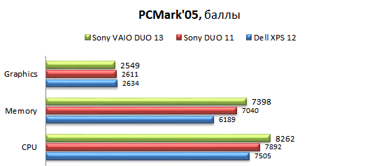 В тестах производительности Sony VAIO Duo 13 демонстрирует высокие результаты, выделяясь на фоне 11-дюймового «собрата» Sony VAIO Duo 11 и гибридного конкурента Dell XPS 12 Convertible Ultrabook. Единственное, в чём Sony VAIO Duo 13 немного проигрывает конкурентам, так это в графическом тесте.