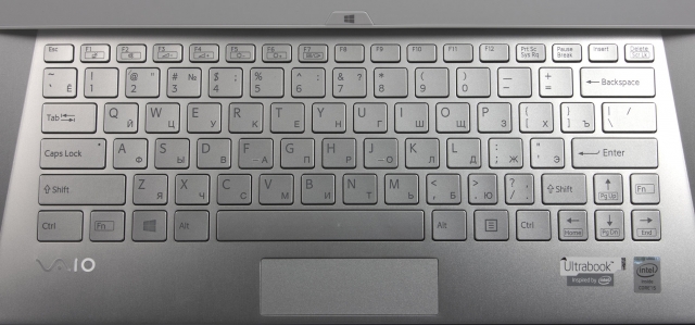 Между кнопками клавиатуры Sony VAIO Duo 13 имеется достаточно много свободного пространства. Это сделано для того, чтобы пользователь при наборе текста мог избегать ошибочных нажатий. Размеры основных кнопок составляют 14,8х13,3 миллиметров. Функциональные клавиши более мелкие – 13х8 миллиметров. Несмотря на небольшой размер кнопок, набирать текст при помощи клавиатуры трансформера очень удобно. Кнопки нажимаются мягко и бесшумно. Ход у них короткий.