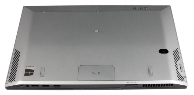 На обратной стороне раскрытого гибридного аппарата можно увидеть заднюю часть дисплея, слот для microSIM-карты, вентиляционные отверстия и алюминиевую стойку шарнира с изображённым на ней логотипом разработчика.