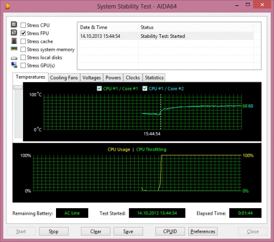 При запуске на устройстве теста Stress FPU, использующего вычисления с плавающей точкой, тактовая частота процессора также составляет 2,3 гигагерца, а температура может подниматься до 68 градусов по Цельсию. В этом же тесте процессор полноценного ультрабука Sony VAIO Pro 13 нагревается до 80 градусов по Цельсию, а затем тактовая частота его работы падает до 1,6 гигагерца. Таким образом, трансформер Sony VAIO Duo 13 превосходит по производительности полноценный ультрабук Sony VAIO Pro 13.