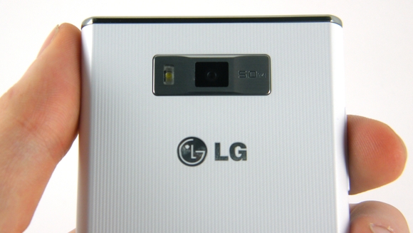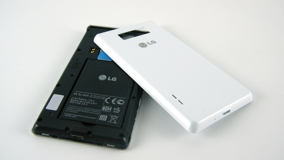 Задняя крышка телефона сделана из тонкого текстурированного пластика, который легко гнется, поэтому пользоваться Optimus L7 нужно осторожно. К счастью, текстура на пластике не собирает много пыли и грязи. На задней крышке находятся пятимегапиксельная камера, LED вспышка и динамик, а на ее задней поверхности - антенна NFC.