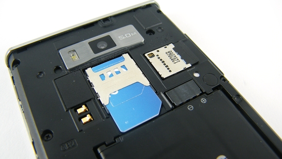Для того чтобы открыть заднюю крышку, нужно поддеть ее чем-то острым. Под крышкой находятся слоты для SIM-карты и карты памяти microSD, если вам понадобится увеличить 4 Гб внутренней памяти. К счастью, SIM-карту и карту памяти можно поменять, не снимая аккумулятор.