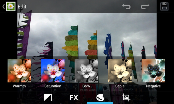 Здесь нет возможности интеграции с социальными сетями, но есть функция базового редактирования: четыре варианта улучшения цвета, семь визуальных эффектов и восемь цветовых эффектов.