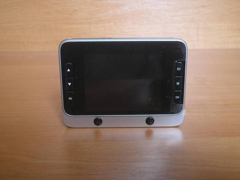 Внизу расположены две кнопки. Одна из них включает и выключает прибор, вторая кнопка является кнопкой «SOS». Эта кнопка предназначена для быстрого сохранения и защиты от перезаписи текущего отрезка видео. Кнопка полезна в случаях, если Вы увидели в пути что-то интересное и хотели бы сохранить это, чтобы пересмотреть потом. В случае спорных ситуаций данная кнопка просто незаменима. По обе стороны экрана расположены клавиши управления регистратором. Назначение практически всех клавиш понятно интуитивно. Клавиши «EV» и «M» отвечают за регулировку экспозиции и вызов меню соответственно. Кроме этого, у некоторых кнопок есть два предназначения. Например, кнопка «вниз» при съемке видео может мгновенно включить или отключить запись звука.