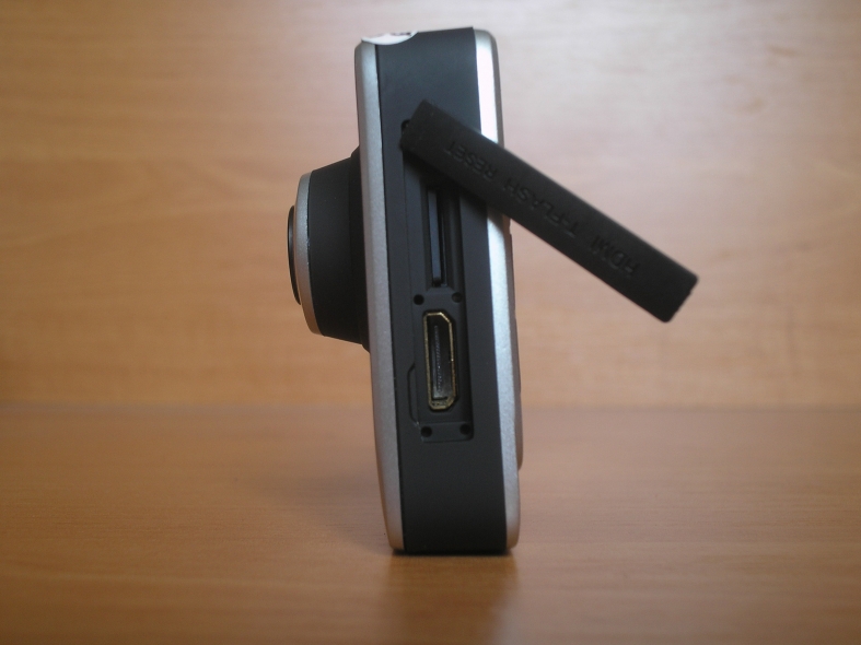 На левой боковой грани расположены слот для карты памяти и HDMI-выход. Благодаря последнему, возможно подключать устройство к телевизору или монитору с соответствующим входом. После такого подключения Вы можете просматривать видео с карты памяти прямо на большом экране. Копировать при этом файлы на ПК не будет необходимости. Наличие такого HDMI-выхода однозначно экономит время просмотра отснятого видео.