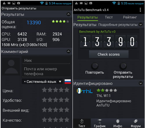 В AnTuTu Benchmark девайс набирает 13390 баллов, в Quadrant Benchmark - 5826 баллов.