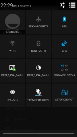 Панель уведомлений выдвигается из строки состояния. Она полупрозрачная. На ней содержится более подробная информация обо всех обновлениях, событиях и уведомлениях. Кроме того, на этой панели можно поменять звуковой профиль, изменить яркость экрана, активировать передачу данных, отключить автоповорот экрана, включить беспроводные модули и тому подобное.