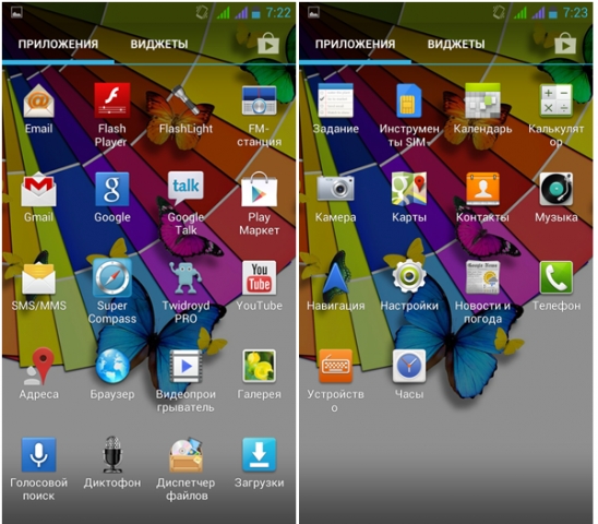 Разработчик не стал забивать внутреннюю память смартфона большим количеством приложений. Но, разумеется, набор самых необходимых программ в устройстве установлен. К ним относятся Adobe Flash Player, FlashLight (фонарик), Super Compass (цифровой компас и уровень),Twidroyd Pro (клиент социальной сети Twitter). Скачать любые другие необходимые приложения можно из фирменного магазина Google Play.