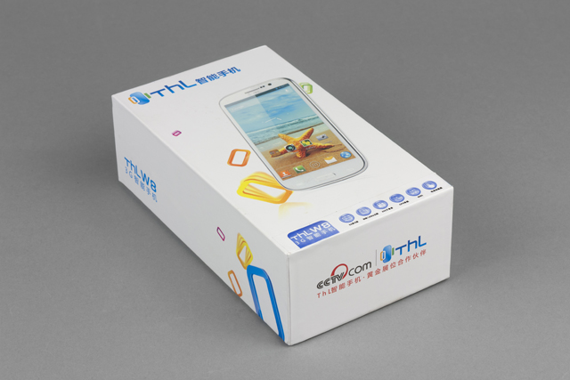 Поставляется ThL W8 в компактной коробке из плотного белого картона. На коробке можно рассмотреть изображение приобретённого смартфона и прочитать его основные технические характеристики. Разработчик позаботился о том, чтобы товар дошёл до покупателя в целости и сохранности: коробка изнутри обклеена поролоном, а все комплектующие аппарата распределены по отдельным пакетикам.