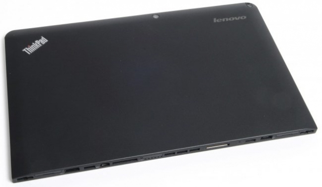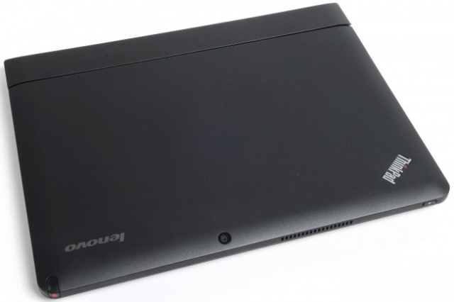 Тыльная панель и боковые грани Lenovo ThinkPad Helix выполнены из практичного в использовании матового пластика с напылением soft-touch, который уже традиционно используется во всех устройствах линейки ThinkPad. В верхней части тыльной панели расположены объектив основной 5-мегапиксельной камеры, логотип производителя, слот для установки стилуса и логотип линейки, к которой принадлежит устройство. Стоит отметить, что в точку над буквой «i» (в названии ThinkPad) вмонтирован мигающий время от времени светодиод красного цвета.