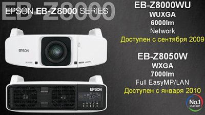 Инсталляционные проекторы серии EB-Z8000: проектор EB-Z8000WU (имеющий разрешение 1920x1200 пикселей, и световой поток 6000 лм) и проектор EB-Z8050W, (имеющий разрешение 1280x800 пикселей и и световой поток 7000 лм), и плюсом к этому - расширенны сетевые возможности.