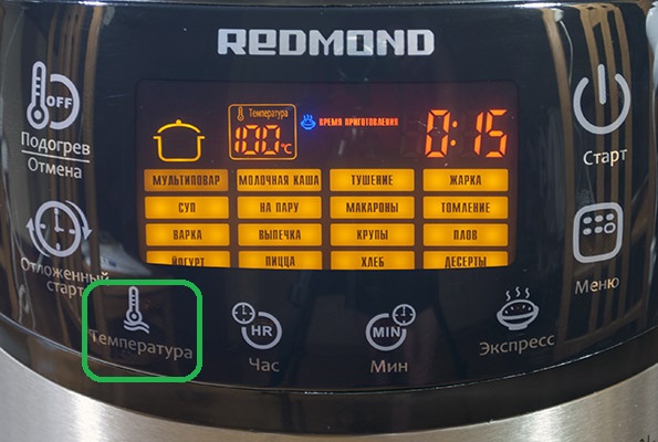 _Приготовление фондю_. Традиционное приготовления фондю осуществляется на открытом огне в специальной посуде из жаростойких материалов. Однако, Redmond RMC-M90 также неплохо справится с приготовлением данного вида блюд. Приготовление начинается с отмеривания ингредиентов согласно рецепту и помещения их чашу. После закрытия крышки и подключения прибора к электросети можно начинать программную настройку процесса приготовления. Сперва нужно выбрать режим «Мультиповар» и нажатием на кнопку «Температура» задать необходимую температуру, при которой будет проходить готовка блюда. Кнопками «Час» и «Мин» устанавливается продолжительность приготовления. При необходимости можно установить функцию отложенного запуска. Если такая потребность отсутствует, то следует сразу нажать кнопку «Старт».