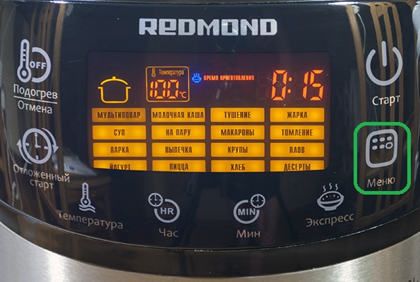 Изначально для каждого режима выбрано индивидуальное время приготовления. Если вас не устраивают заводские параметры, то их можно изменить по своему усмотрению. Сперва следует выбрать определенную программу приготовления. Для этого на панели существует специальная кнопка – меню.