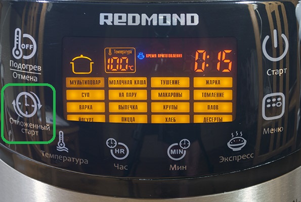 Отложенный старт позволяет получить готовое блюдо в точно указанное время. Такая функция очень пригодится людям с плотным рабочим графиком. Если вы рано утром уходите на работу, а возвращаетесь поздно вечером, то после прихода домой вам придется заниматься приготовлением ужина. А теперь представьте, что зайдя в дом после тяжелого рабочего дня, вы слышите звук мультиварки, который сообщает о завершении приготовления блюда. Вам останется лишь переложить блюдо из мультиварки в тарелку и приступить в приему пищи. Как видите, такая функция является очень полезной и практичной. Чтобы указать время окончания приготовления, следует выбрать нужную программу и нажать кнопку «Отложенный Старт».