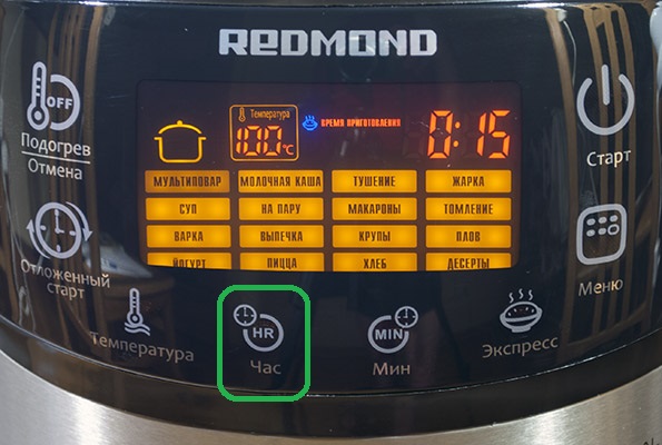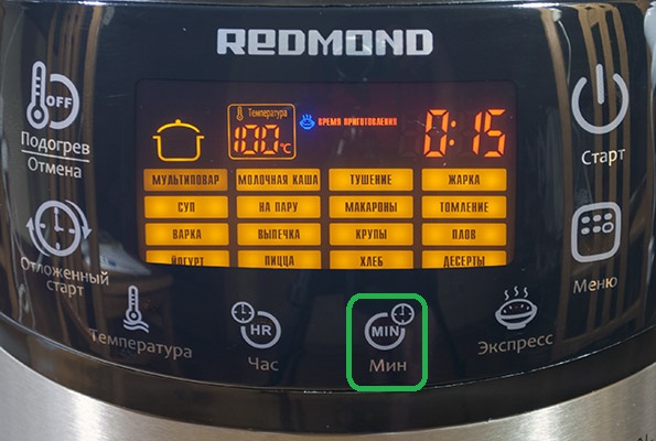 Кнопками «Час» и «Мин» устанавливается время приготовления. Если данный шаг пропустить, то мультиварка будет готовить блюдо в течение установленного по умолчанию времени - 15 минут. На этом этапе можно активировать функцию отложенного старта. Если она в данном случае не требуется, то следует нажать и удерживать кнопку «Старт». После этого на дисплее начнут отображаться соответствующие индикаторы, а прибор начнет процесс приготовления.