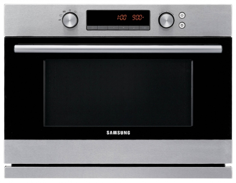 Микроволновая печь – это не рядовой представитель бытовой техники, это особенный электроприбор, в котором используются высокочастотные электромагнитные волны. При прямом воздействии эти волны могут наносить вред человеческому организму, поэтому микроволновка должна обладать надежным корпусом. Если микроволновка правильно разработана и качественно собрана, то магнитные потоки будут распространяться исключительно внутри электроприбора. Как раз таким устройством является Samsung FQ159STR. Ее стенки изготовлены из металла, окошко дверцы защищено стеклом и решеткой. Крышка довольно плотно закрывается, что позволяет еще раз убедиться в изоляции рабочего пространства. Вращательные переключатели крутятся мягко и без люфтов. Дисплей очень надежно вмонтирован в корпус, так что воздействие воды и других факторов не повлияет на его работоспособность. Поскольку Samsung FQ159STR является встраиваемой духовой печью, то она устанавливается преимущественно под столешницей. Поэтому дверца электроприбора открывается как на традиционной духовке – вниз. Если говорить о габаритах и весе, то следует сказать, что Samsung FQ159STR довольно объемная и тяжелая. Но в данном случае это скорее преимущество, нежели недостаток. Ведь большой вес микроволновке придает толстый металлический корпус, который удерживает микроволны внутри электроприбора. А поскольку внутренний объем духовки равен 42 литра, то габаритные размеры печи будут иметь высокие значения. Вес комплекта составляет приблизительно 46 кг, габариты: 595x460x520 мм (ШхГхВ).
