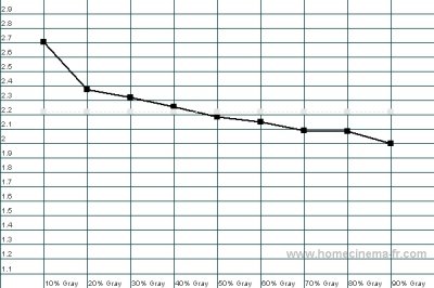 Стандартні тести показують, що максимальна яскравість білого в режимі "Кіно" складає близько 400 кд/м2 при мінімальній 20 кд/м2 - в наявності відмінна робота блоку управління підсвічуванням. До речі, регулюється інтенсивність підсвічування окремим пунктом меню (20 східців), а налаштування "Яскравість" і "Контрастність" виконуються за допомогою цифрової обробки зображення, що поступає на ЖК-панель. В результаті для найбільш рівного відображення градієнтів і відсутності клиппинга у світлих і темних областях рекомендуємо раз і назавжди зафіксувати їх на значеннях 45% і 90% відповідно і при необхідності користуватися регулюванням інтенсивності підсвічування.