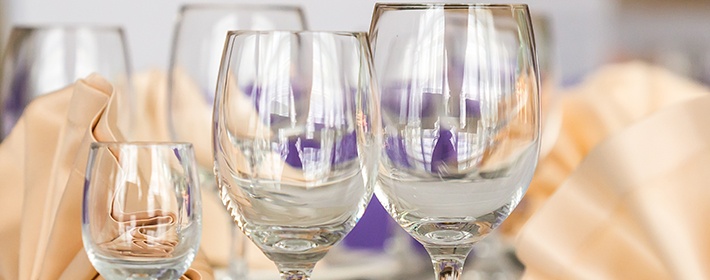 - Бокалы, стаканы и рюмки — справа. Обычно расставляют по убывающей, начиная с бОльшей емкости. Чем крепче вино, тем в меньший по объему бокал его наливают.