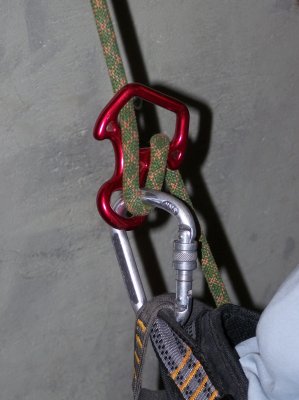 Однако, использование для спуска или страховки одного лишь карабина, можно порекомендовать только как запасной или аварийный вариант. Недостатки такого применения - это невозможность использования для спуска сдвоенной веревки и большие затруднения в случае необходимости остановки при спуске. Т.е. теоретически остановиться возможно, но это потребует определенных физических усилий, а если при такой остановке необходимо будет освободить обе руки, то и некоторой фантазии. К тому же карабин очень сильно закручивает веревку и делает её «дубовой», что само по себе довольно неприятно при её (веревки) дальнейшем использовании.