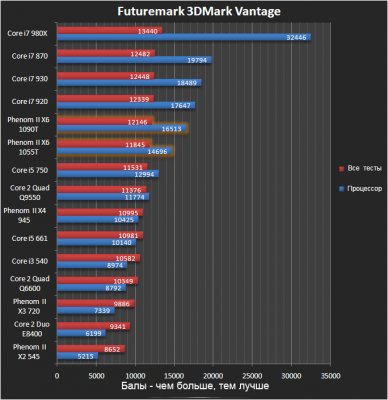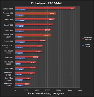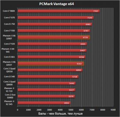 В данном тесте мы видим результаты идентичные результатам CINEBENCH R10 и PCMark Vantage. По производительности процессора 1090T и 1055T занимают 2-е и 5-е места соответственно, а в сравнении общей производительности системы с этими процессорами сдают позиции.
