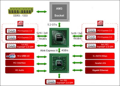 Хотя процессор может работать на многих платах среднего уровня, полный потенциал новинки раскроется только на материнских платах с чипсетом 890FX, а в паре с южным мостом SB850 пользователь получит пользователю отличную функциональность системы, включая поддержку CrossFireX и 6-ти гигабитный SATAIII. Более подробно изучить функциональность 890FX чипсета можно по приведенной ниже схеме.