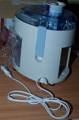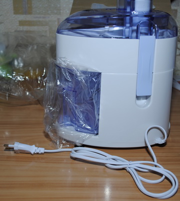 Из нижней части соковыжималки выведен шнур питания. Он тут небольшой (в длину всего около метра) и довольно тонкий (мощность прибора тут небольшая). Да и, как правило, подобная техника всегда имеет короткий шнур. Системы заземления прибор не имеет. Соковыжималка работает напрямую от стандартной электрической сети (220-240 В, 50 Гц). Максимальная мощность встроенного электродвигателя составляет 350 Вт. Это немного, есть модели с большей мощностью (500-700 Вт) и соответственно большей производительностью. Но в небольшой мощности есть и свой плюс - уменьшенное энергопотребление. Хотя для переработки и отжима сока из небольших объемов фруктов такая модель в самый раз. Кстати, производитель сообщает, что непрерывное время работы соковыжималки не должно превышать 2-3 минут. После минутной паузы можно снова включать устройство.