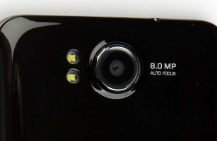 Задняя панель съемная, на своем месте удерживается за счет пластиковых защелок и чрезвычайно трудно отрывается от корпуса. Окошко камеры, расположенное на задней панели, довольно сильно выступает из корпуса. Поэтому оно играет роль определенного защитного уступа. Благодаря нему задняя панель смартфона не будет царапаться о поверхность стола. Другой вопрос – не будет ли царапаться само стекло камеры, но, вроде бы, и с этим все в порядке, так как его защищает ободок. Возле окошка динамика расположена сдвоенная светодиодная вспышка, а чуть ниже – решетка внешнего динамика, имеющая выгнутый наружу прутик для беспрепятственного выхода звука.