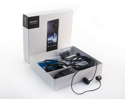 Xperia V упакован в непривычно маленькую плоскую коробку из белого картона. Все модели смартфонов Sony имеют различные по размеру и форме коробки, но компоновка надписей и цвет всегда остаются узнаваемыми. В комплект поставки входят смартфон, мощное зарядное устройство с USB-разъемом, соединительный USB-кабель, проводная стереогарнитура с наушниками-вкладышами и комплектом насадок-переходников для них, руководство пользователя.