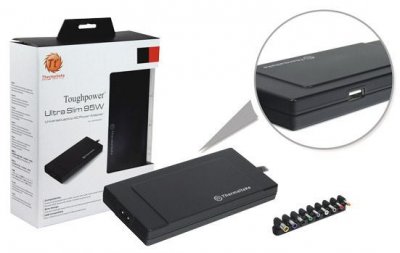 Thermaltake в своей серии Toughpower, преподнесла новый блок питания. На этот раз это БП предназначено для тех кто владеет ноутбуками и другими мобильными устройствами. Toughpower Ultra Slim 95W – это универсальный адаптер питания, который представляет собой тонкое, компактное устройство. БП обеспечивает постоянно 95Вт, но при пик нагрузке может выдавать и всё 120Вт, при этом в комплекте к нему поставляется масса различных коннекторов питания. Список устройст которые можно питать с помощью Toughpower Ultra Slim 95W просто громадный.