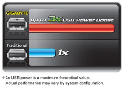 Благодаря возросшей энергоэффективности портов появилась возможность подключать к ПК энергоемкие USB-устройства (например, внешние оптические накопители), работая без проблем с любыми медиа носителями. В отличие от системных плат GIGABYTE Р55А-серии прочим изделиям такая возможность недоступна. При этом следует понимать, что повышение мощности не скажется на времени зарядки устройств, подключенных к USB-портам: оно не изменится.