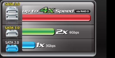 Официальное название третьего поколения интерфейса Serial ATA - SATA 6Gbps (пиковая пропускная способность до 6 Гбит/с). Интерфейс SATA3 на системных платах GIGABYTE реализован средствами контроллера Marvell 88SE9128 (четыре SATA-порта, возможность создания RAID-массивов). В настоящее время интерфейс SATA 3 наиболее востребован в составе ПК оснащенного быстрыми твердотельными SSD-накопителями. Преимущество в скорости интерфейса SATA 3 заметнее всего проявляется на примере дисковых массивов уровня RAID 0 (пропускная способность до 12 Гбит/с).Функция 3х USB Power Boost