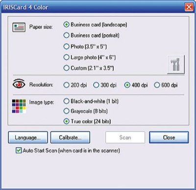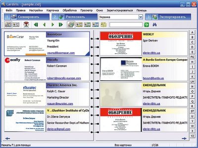 Процесс сканирования можно запустить с помощью кнопок на передней панели, которые при необходимости можно перепрограммировать. При необходимости ввода большого количества можно выставить автоматическое сканирование, когда сканирование запускается, как только визитка попадает в щель. Предусмотрено также сканирование обратной стороны визитки. Распознавание проводится либо по одной, либо всех сразу отсканированных визиток. По умолчанию разрешение 400 dpi, но при необходимости можно выставить на максимум или включить режим точного распознавания. Программа сама определяет ориентацию и расположение текста. Имеется свой инструмент для поддержки списка контактов. Располагает возможностью поиска дубликатов по разным полям и возможностью объединения их в одну запись. Полученную информацию может синхронизировать и экспортировать в Microsoft Outlook, Palm Desktop, Windows Address Book, Entourage, IBM Lotus Notes и в другие. Доступен экспорт данных в Microsoft Excel.