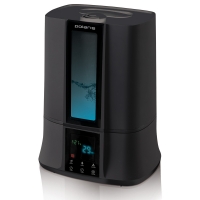 На переднем плане корпуса расположены декоративная панель и жидкокристаллический дисплей с сенсорной панелью управления. На дисплее отображаются показатели температуры (в увлажнителе находится встроенный термометр) и влажности воздуха. В таблице, которая расположена ниже, отображены функции увлажнителя, параметры которых вы можете задать с помощью панели управления или дистанционного пульта управления (идет в комплектации с прибором).