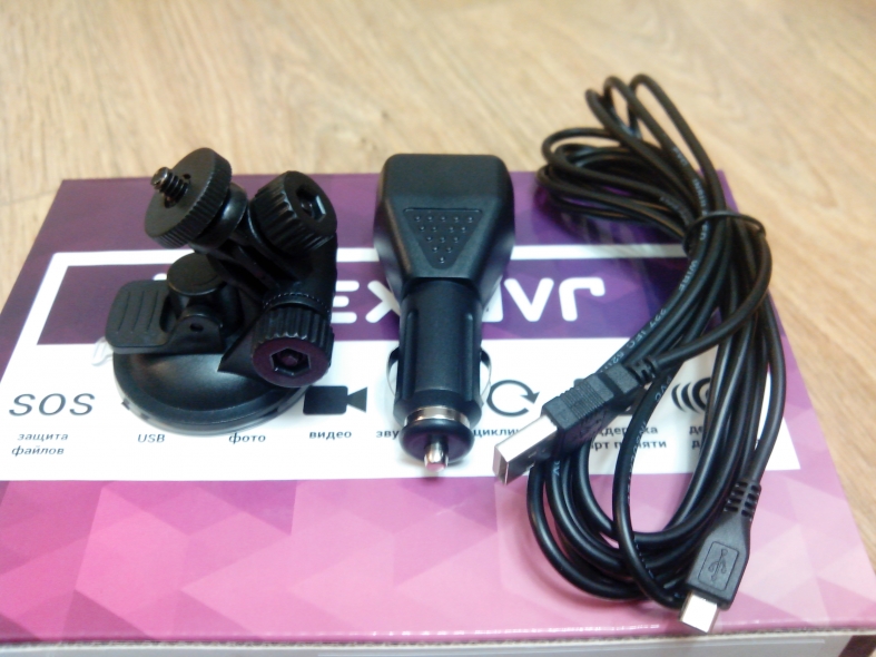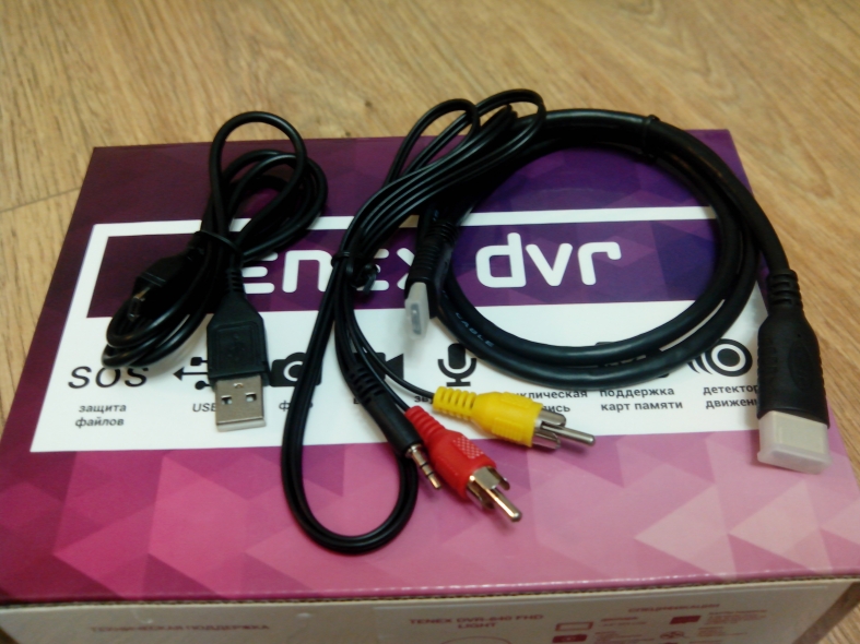 Комплектация Tenex DVR 640 FHD довольно богатая. В комплект входят: автомобильное крепление, автомобильное зарядное устройство с достаточно длинным шнуром, USB-кабель, HDMI-кабель, видеокабель и карта памяти, объемом 8 Гб.