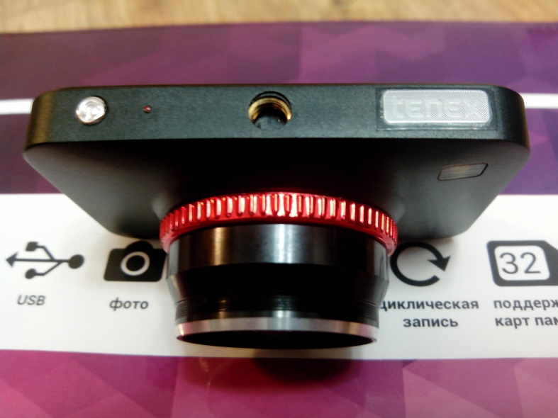 На верхней грани аппарата расположены: кнопка включения, светодиодный индикатор, резьба для установки автомобильного крепления и фирменный логотип «Tenex».